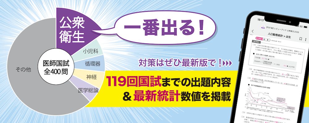 医師国試で最も出題数が多い「公衆衛生」対策に必携のコンテンツ。これまでに国試で出題された箇所が問題番号付きで示されており、最新の統計データと要点がコンパクトにまとまっています。